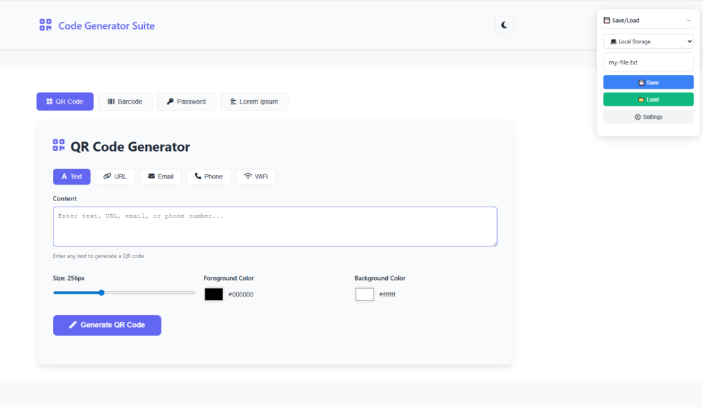 All-in-one code generator: QR codes, barcodes, secure passwords, and lorem ipsum text.